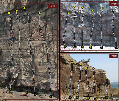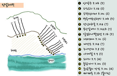 진널전망대 입구에 도착했을 때, 웃기지만 바위보다는 화장실을 먼저 찾았던 게 개인적으로는 꽤 괜찮은 일이었다. 꽃이 핀 동백나무가 양 옆으로 늘어선 계단을 투덜거리며 한참을 오르고 나서야 전망대와 그 뒤의 화장실이 나타났고 그 곳에서 한 눈에 보이는 해벽과 바다는 가슴을 탁 트이게 했다. 그 곳의 공터는 꽤 넓어 제재만 없다면 바다를 내려다보며 야영을 해도 굉장히 근사할 것 같아 보였다. 개척된 바위는 크게 3 구역으로 나뉘어 있다. 바위를 정면으로 봤을 때 좌측 벽에는 페이스 루트 4개가 있다. 중앙에는 오버행 루트들이 5개, 그리고 바다와 닿은 벽에는 여름철 딥 워터 솔로잉도 가능한 볼더링 루트까지 포함해 6개의 루트가 있다. 좌벽과 중앙벽 사이에는 아직 개척된 루트가 없이 텅 빈 공간처럼 남아 있었는데 앞으로 재밌는 루트들이 많이 개척될 가능성이 높아 보인다는 한 동행인의 설레는 모습도 볼 수 있었다. 난이도는 5.8부터 5.12.a/b까지 다양한데, 특히 5.10급 루트가 적지 않아 초보자들이 하루 이틀 즐기기에 충분하고 5.11대와 5.12대의 루트도 각각 4개, 3개씩 있어서 5.12대 루트를 한창 즐겁게 등반할 수 있는 중급자들에게도 안성맞춤인 곳이었다. 그렇다고 상급자들에게 시시할 수만은 없다. 칼로 자른 듯 판판해 마찰력이 크게 작용할 것 같지 않은 암질을 접할 기회는 흔치 않을 것이다. 새로운 곳에서는 레드포인트에서 잠시 벗어나 온사이트나 플래싱 도전만으로도 하루가 금방 지나갈 것이다. 중앙벽의 오버행 루트 몇 개가 눈에 들어왔지만 나는 먼저 몸풀이 삼아 좌벽의 ‘인어공주(5.10b)’와 ‘수평선너머(5.10b)’를 했다. 오랜만에 등반하는 페이스 루트라 긴장도 되고 평소 잡아본 적 없는 바위를 잡으려니 온몸이 경직되었다. 아마도 그 날 바람만 불지 않았더라면 내리쬐는 태양 아래 긴장감이 더해져서 땀을 많이도 흘렸을 것이다. 5.10급의 루트치고 첫 발을 내딛는 시작부분에서 쉽지는 않았다. 이 곳 바위는 전체적으로 역층으로 형성돼 있는데 안쪽으로 움푹 파고 들어간 바위 하단에서 발을 어디에 두고 첫 홀드를 잡아야 할지 잠깐 난감했으니 말이다. 루트는 등반을 많이 하지 않은 듯 초크 자국은 거의 없고 동작은 계단을 오르듯 손과 발이 차례차례 오르면 된다. 평이하게 오르다가 상단 앵커에 줄을 걸 때는 대범함이 필요할 것 같다. 좌벽 상단은 살짝 튀어나온 루프 형식으로 이루어져 있는데 그 튀어나온 곳에 앵커 고리가 공중에 대롱대롱 매달려 있어 줄을 걸려면 몸이 뒤쪽으로 쏟아져 나와 자칫 추락이라도 할 것 같은 기분이었다. 같은 바위 한 면에 있는 루트라서 그런지 ‘파도소리(5.11a)’의 전체적인 루트의 특성은 비슷했다. 살짝 애매한 시작 부분과 공포스러운 앵커가 그러하다. 하지만 이 루트를 등반하고 내려왔을 때 빌레이어는 루트가 어떤지 물었다. 나는 단 한마디로 잘라 말했다. “웃겨! 한번 해봐!” 온사이트로 등반하다 보면 ‘아, 이제 뭔가 크럭스가 나오는구나. 긴장해야겠구나.’ 하는 순간들이 찾아오기 마련이다. ‘파도소리’도 예외는 아니었는데 그런 순간이 올 때마다 긴장감을 제대로 즐겨볼 새도 없이 곧 허무하게 만들어버리는 건 닥터링 홀드였다. 크럭스가 시작되기 직전 홀드에 매달려 숨을 고르며 고개를 빼고 다음 홀드들을 찾았다. 다음 홀드가 잘 보이지 않아 저 위에 있는 홀드만 바라보며 ‘뛰어야 하나? 아님 발을 있는 대로 높이 올려야 하나?’ 하고 잠시 고민하는 도중에 보이는 건 아무것도 잡을 것이 없을 것 같아 보이는 벽면 깊숙이 패여 있는 홀드였다. 잡고 보면 ‘하하하~’ 헛웃음이 나올 정도로 ‘잘’ 파 놓았다. 암장 전체 루트들의 난이도를 고루 만들고 싶어 그랬는지는 모르겠지만 있는 그대로 놔두었다면 좀 더 자연스러운 동작이 나오지 않았을까. 미리 동작을 그려 놓고 홀드를 만든 꼴이라 과연 자연바위 등반의 묘미는 어디에서 오는 것인가라는 의문마저 든다. 중앙벽의 ‘당신의 하늘(5.12a)’. 시원스러우면서도 어딘가 모르게 애잔함이 엿보이는 루트명부터 맘에 들었다. 바위 하단은 마치 다른 종류의 암석을 잘라다 끼어 넣은 듯 했는데, 응집성이 덜하여 모래가 으석거리며 쉽게 부서지는 그런 느낌이었다. 홀드 하나하나 잡을 때마다 손가락 사이에서 모래알들이 거칠게 잡혀 자칫 손이 빠져 버릴 것 같았다. 중단 부분부터는 시원하고 과감한 동작이 이어진다. 크럭스는 주변의 튀어나온 바위의 각도를 잘 이용해 발을 쓰는 것이 관건이다. 크럭스 부분의 바위가 맨질한 듯 발을 딛게 상당히 두렵기는 했다. 이 루트의 마지막 홀드에서도 나는 또 한 번 웃음이 빵 터졌다. 손가락 모양까지 고려해 홀드를 만들어져 있어 순간 나는 ‘하하하~ 이 홀드는 왜 이래~’! 첫 시도에서 동작을 풀며 오버행의 부담감과 크럭스의 미묘한 발란스에서 오는 공포감만 줄이면 완등하는 데는 큰 무리가 없을 것 같다는 생각을 했다. 이미 날이 저물어 가고 있던 터라 다른 루트들을 시도해 볼 여유는 없었다. 따사롭게 저물어가는 햇살을 등 뒤로 두 번째 시도에서 ‘당신의 하늘’을 시원하게 바라보고 내려왔다. 5.12급