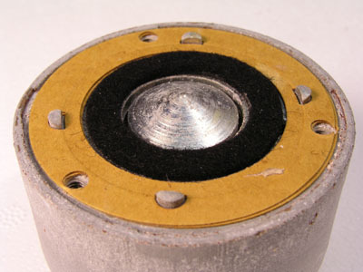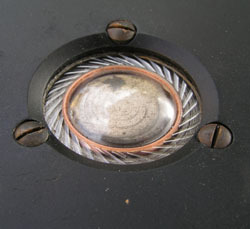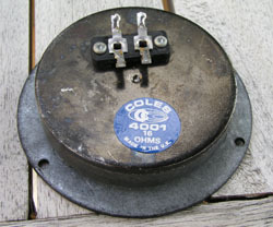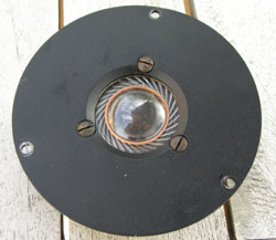 | Coles 4001 supertweeter. I still have to measure this fellow flush mounted on a panel without 15 mm cabinet edge fillets in the neighbourhood. The wires from the voice coil are extremely thin and I did not dare unsoldering the wires from the soldering tags on the rear to remove the diaphragm and add a thin felt pad on the polepiece. I wonder why this driver has a 16 ohms rating having a DC resistance of 23 ohms. |