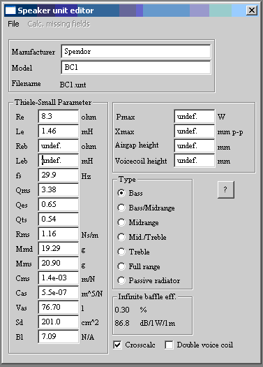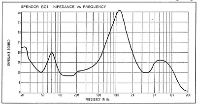 The Spendor BC1 ("BC" = Bextrene Cone or Bextrene Chassis) is basically a three-way system with points of crossover around 3 kHz and 13 kHz. The midbass is a small 8" driver fitted with a bextrene cone and an inverted rubber surround, in fact quite similar to the KEF B200, SP1039. From 3kHz the Celestion HF1300 tweeter is taking over and runs up to its intrinsic upper limit around 13 kHz from where it rolls off steeply as can be seen from the graphs below. To help in the top octave, a Coles 4001 supertweeter is used; a small 3/4" tweeter fitted with a plastic dome. The 4001 supertweeter has a 23 ohms DC resistance, quite unusual. Generally the DC resistance of all drivers are high, making this speaker an ideal partner for valve amplifiers.