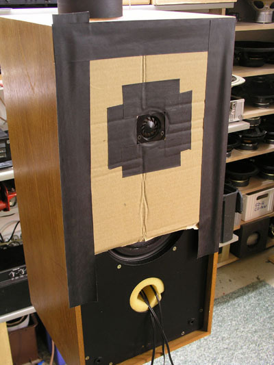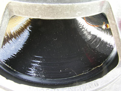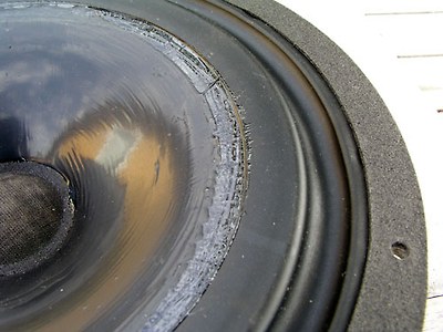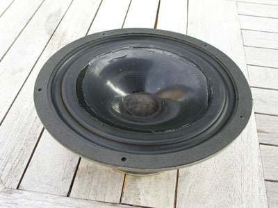 However, the coating on the rear of the diaphragm is in perfect condition and on the front it has been repaired with some slightly sticky stuff that may actually be better suited for the front, being more flexible than the original coating. Whether a new coating may produce the same result as the old coating is very unlikely, but in this case it's only some 2-8 mm along the rubber surround and from the SPL readings taken on the bass driver alone, there does not seem to be anything abnormal going on.