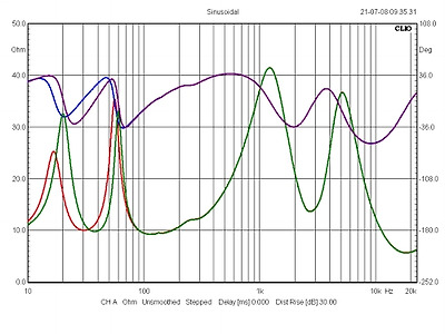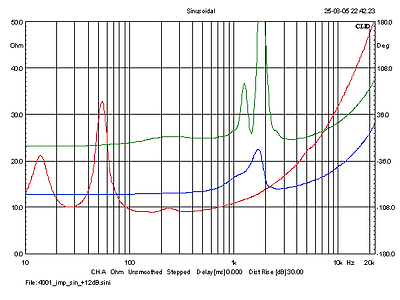 Impedance of drivers in cabinet. Red = BC1 midbass, blue = HF1300, green = Coles 4001.
