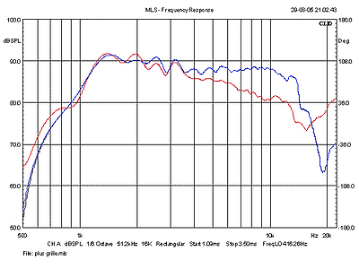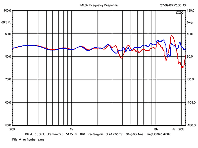Frequency response plus/minus front grille. Red = incl. front grille.