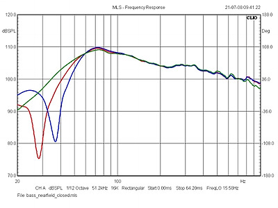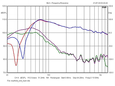 Left: Nearfield response of bass driver. Red: as-is, blue = no foam in vent. Green = closed box. Right: Nearfield response of bass driver with foam in vent (red) and no foam in vent (blue). Purple = nearfield response of port with no foam in vent, green = with foam in vent. The port response is remarkably free of any peaks higher up in the midrange. Quite unusual. |
