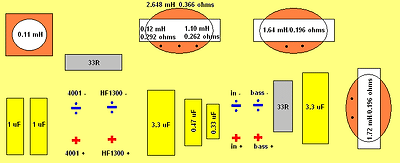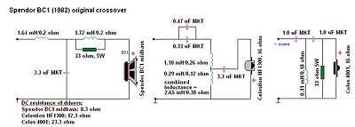 BC1 crossover schematics. Third order for the midbass. Third order high-pass for the HF1300; no low-pass filter for the HF1300. This tweeter rolls off steeply from above 13 kHz. HF1300 attenuation is achieved from a tapped inductor. Third order for the supertweeter. If anyone have other BC1 schematics I'd be very interested. |
