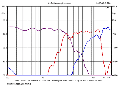 Frequency response of individual drivers with crossover attached. The midbass in an example to follow. The HF1300 has a dip at 3.5 kHz - or is it a bump at 2.5-3 kHz? The Coles 4001 supertweeter does have a lot to say in the upper treble region despite a 3rd order crossover around 13 kHz. |