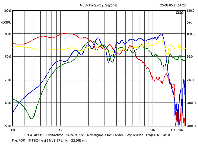 Frequency response of individual drivers measured at 1 metre distance. Red = midbass, blue = HF1300 tweeter, green = Coles 4001 supertweeter. Yellow = combined response with crossover. The midbass displays an overall smooth response with no serious cone break-ups. The HF1300 has a deep dip around 3.5 kHz, which is caused by the cabinet lips protruding some 15 mm in front of the front panel. See graphs below on HF1300 response from flush mounting. The Coles 4001 seems to have a much too low response to be able to level with the other drivers and I'm not sure why there is a discrepancy from the responses with and without crossover attached. I'll have to repeat these measurements to see what's going on. The 4001 has a 23 ohms DC resistance, which counts for it's apparent very low sensitivity. |