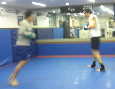 최무배 선수를 인터뷰하러 팀태클에 찾아갔다가 뜻밖에 훈련하는 최홍만 선수를 만났습니다. 최홍만은 12월 9일에 열리는 K-1 GP FINAL 레이세포전에 대비해 최무배, 랜디김, 양해준과 돌아가면서 스파링하고 있었습니다. 오사카 정도회관에서 김태영 사범과 함께 훈련하고 있을거라고 생각했는데 의외였습니다. 훈련이 끝나길 기다리면서 핸드폰으로 한장찍었는데 역시 핸드폰으로 이렇게 뿐이 안나오는군요. 평상시에 카메라를 들고 다녀야 하는데 게으름이 문제였습니다. 하여간 잠시 구석에 앉아서 최홍만 대 최무배, 최홍만 대 랜디김, 최홍만 대 양해준의 스파링을 돌아가면서 구경하는 특권을 누렸습니다.