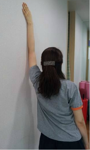 1. 바로 선 자세에서 한쪽 손을 벽 위로 멀리 짚고 겨드랑이, 등근육을