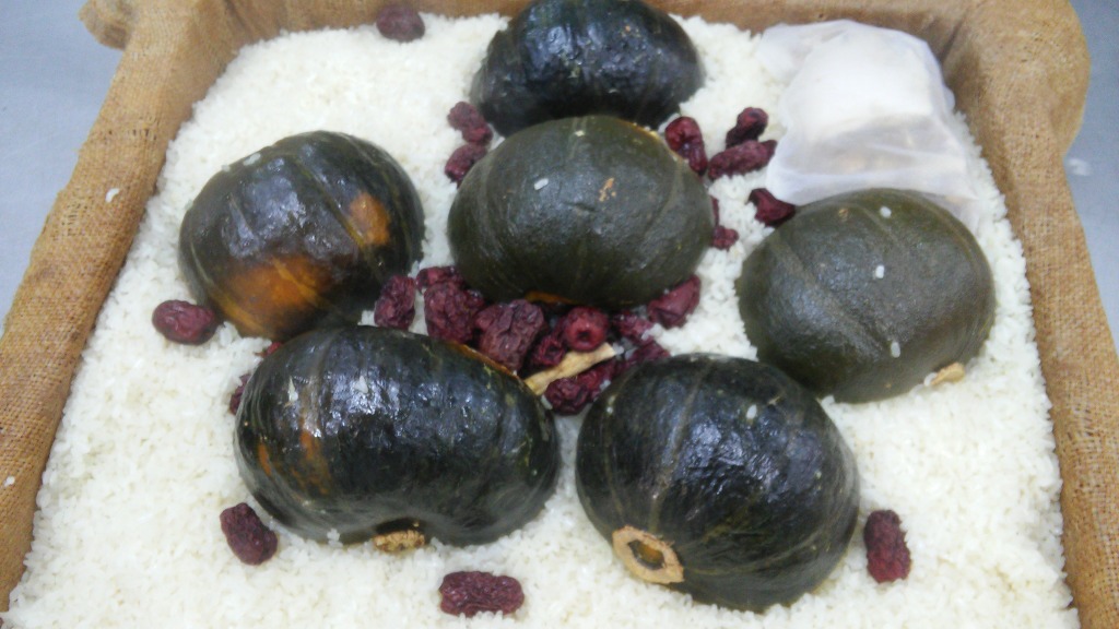 찹쌀 위에 미니 단호박 3개 대추 20알 정도 올려 쪄서 고두밥 만들어서