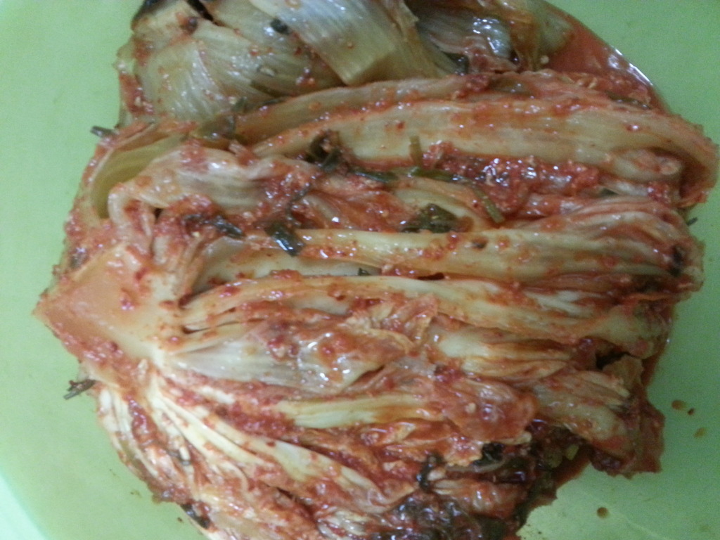 그 물에 신김치 씻어서 썰어 넣고,