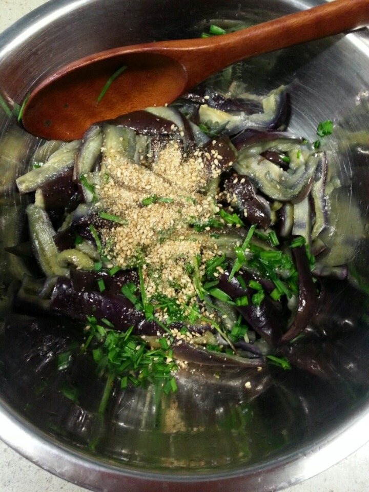 부추, 들기름, 볶은깨를 넣고 무쳐줍니다.