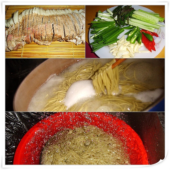 돼지고기 부드러운 부위랑,국수랑 양념(청홍고추,마늘4쪽,파,오이,고추가루,깨소금)