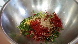 (고추가루 마늘 깨소금 참기름 파 청량고추 )