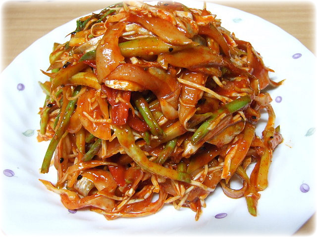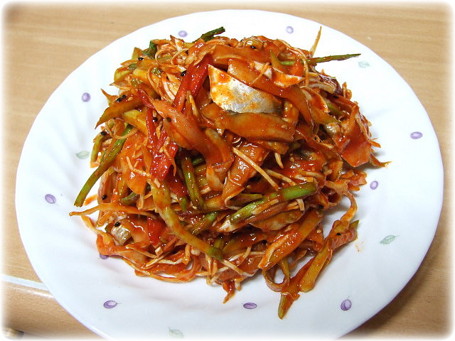 밴댕이와 미나리, 오이, 양파, 파를 넣고 초고추장 양념으로 골고루