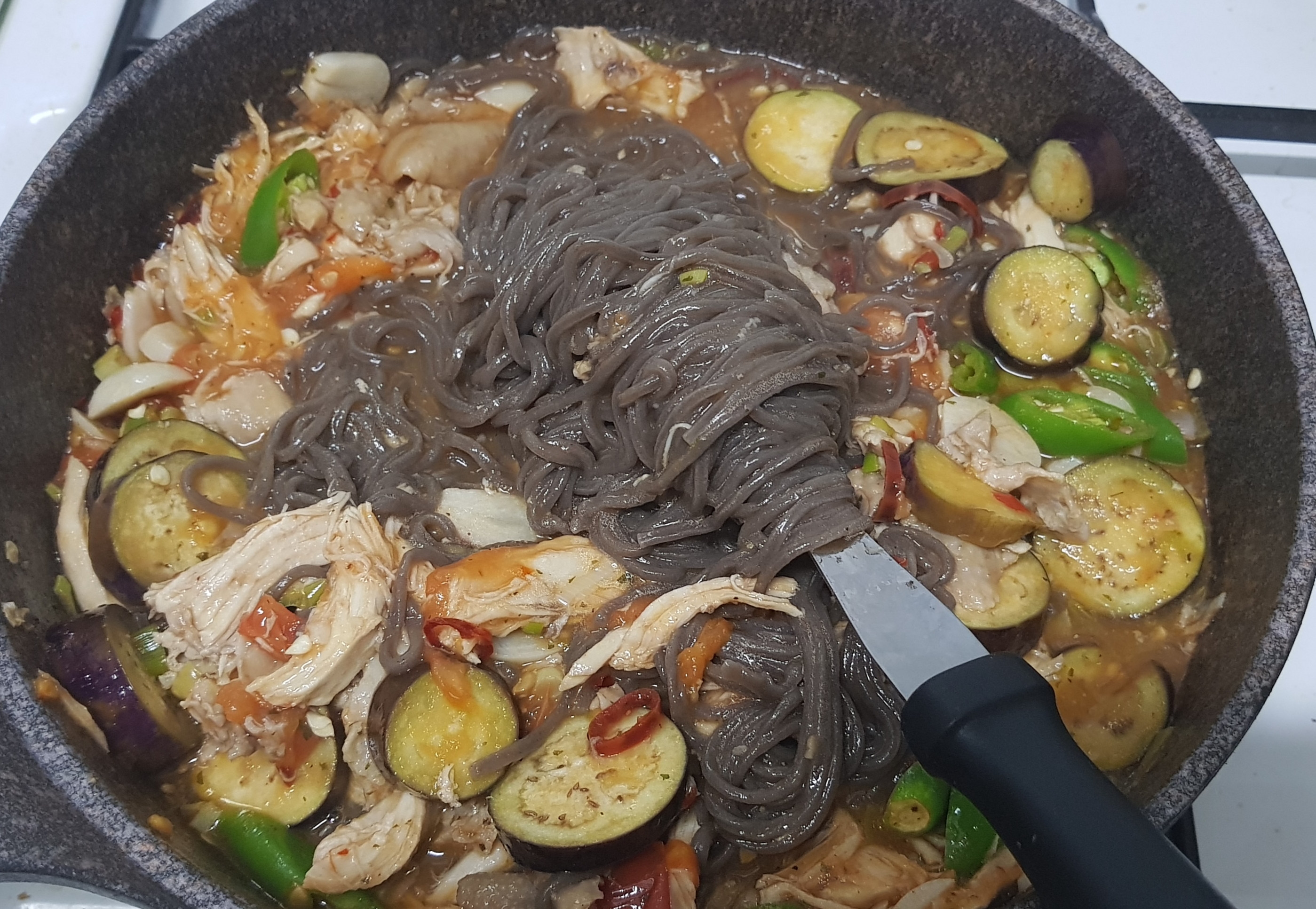 삶아지 메밀국수넣고 섞어줍니다