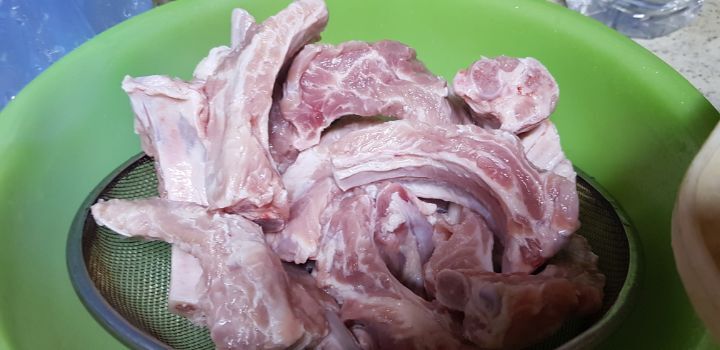 냉수에 담가 뼈의 핏물을 뺀 등갈비를 물기를 빼줍니다