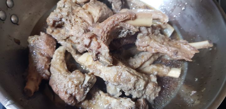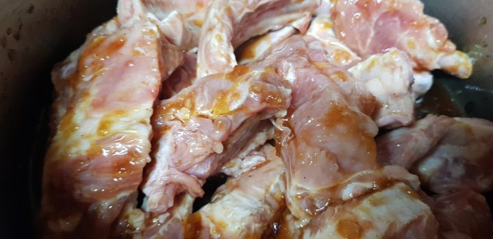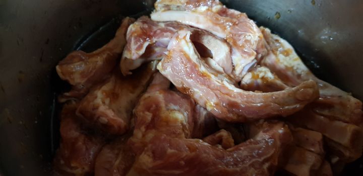 물기를뺀 등갈비를 양념장에 재웠다가 일반압력밥솥에 넣어 불을켜고 추가 움직이면 불을 낮춰서 뭉근하게 끓여줍니다
