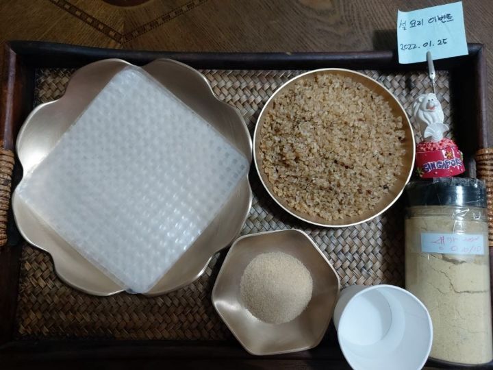 준비재료는 말린잡곡쌀,생강,생수,설탕, 라이스페이퍼,조청입니다