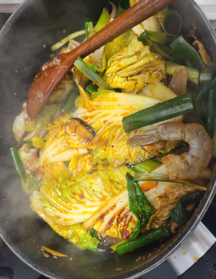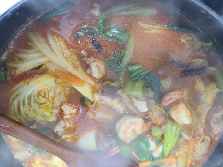 야채부터 넣고 볶다가 고추가루 간장 굴소스 후추로 간을 해주고 해물을 넣어요. 끓는물을 넣고 간을보고 차돌배기 넣어줬어요.