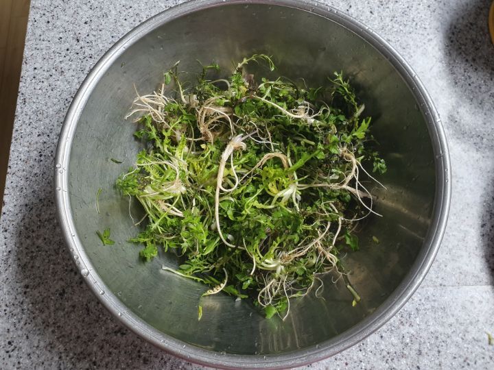 냉이를 손질후 깨끗이 씻어 주고 큰냉이는 등분하고 물기를 빼 줍니다