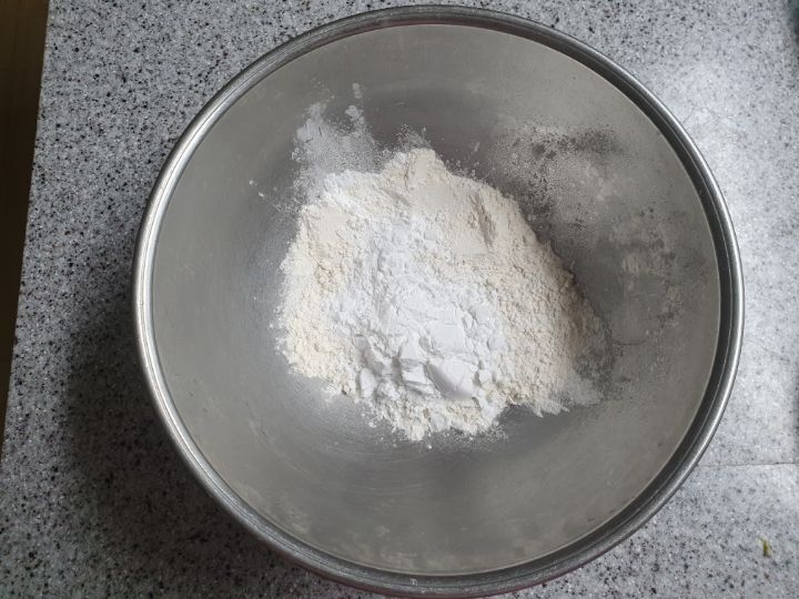 부침가루(100g), 전분가루(100g)를 동양으로 넣어 줍니다