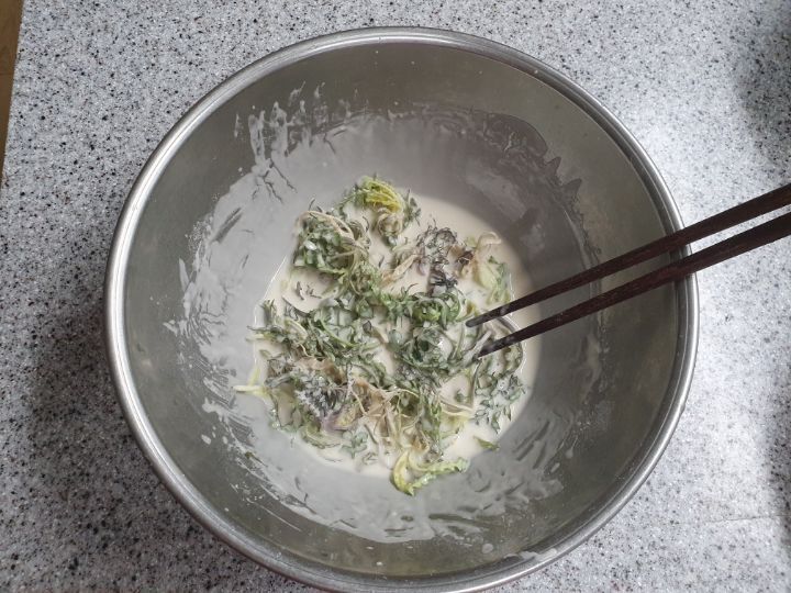 젓가락으로 반죽과 섞어 줍니다