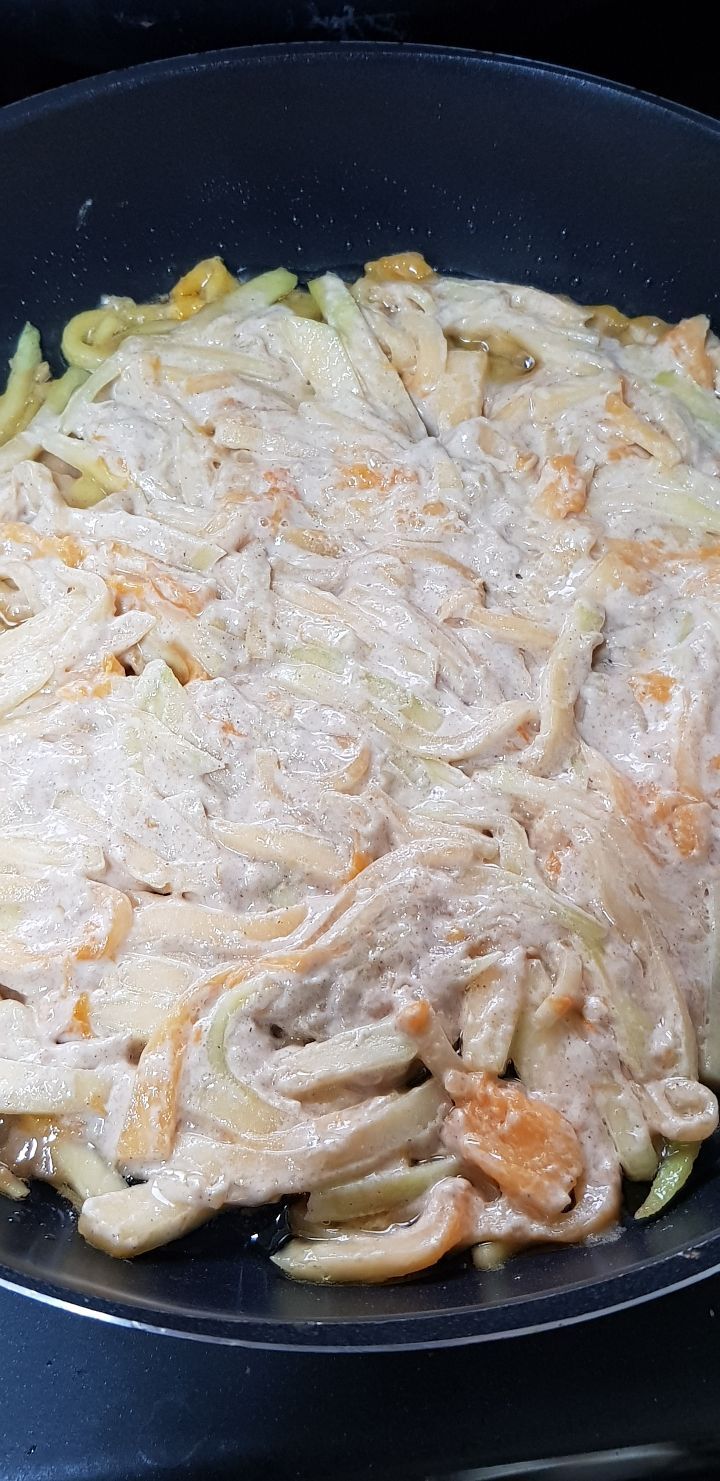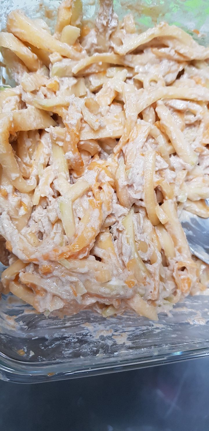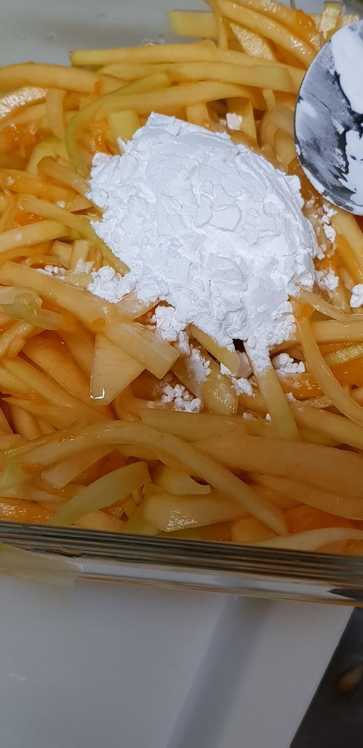 살짝 절여진 늙은호박채 그대로에 돼지감자가루(감자전분이나 옥수수전분도 좋아요)1수저와 밀가루 1컵정도 넣고 골고루 섞어줘요.