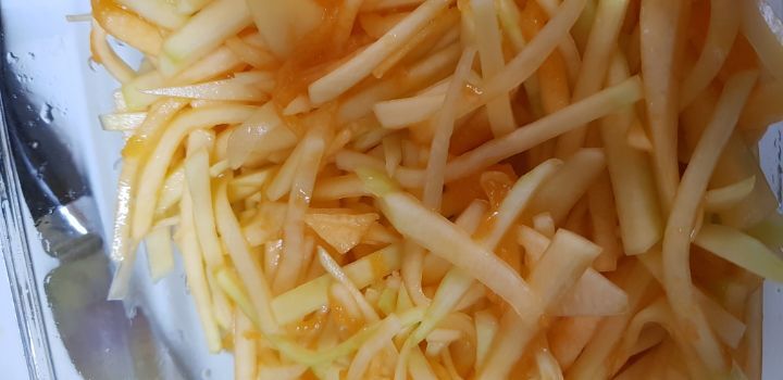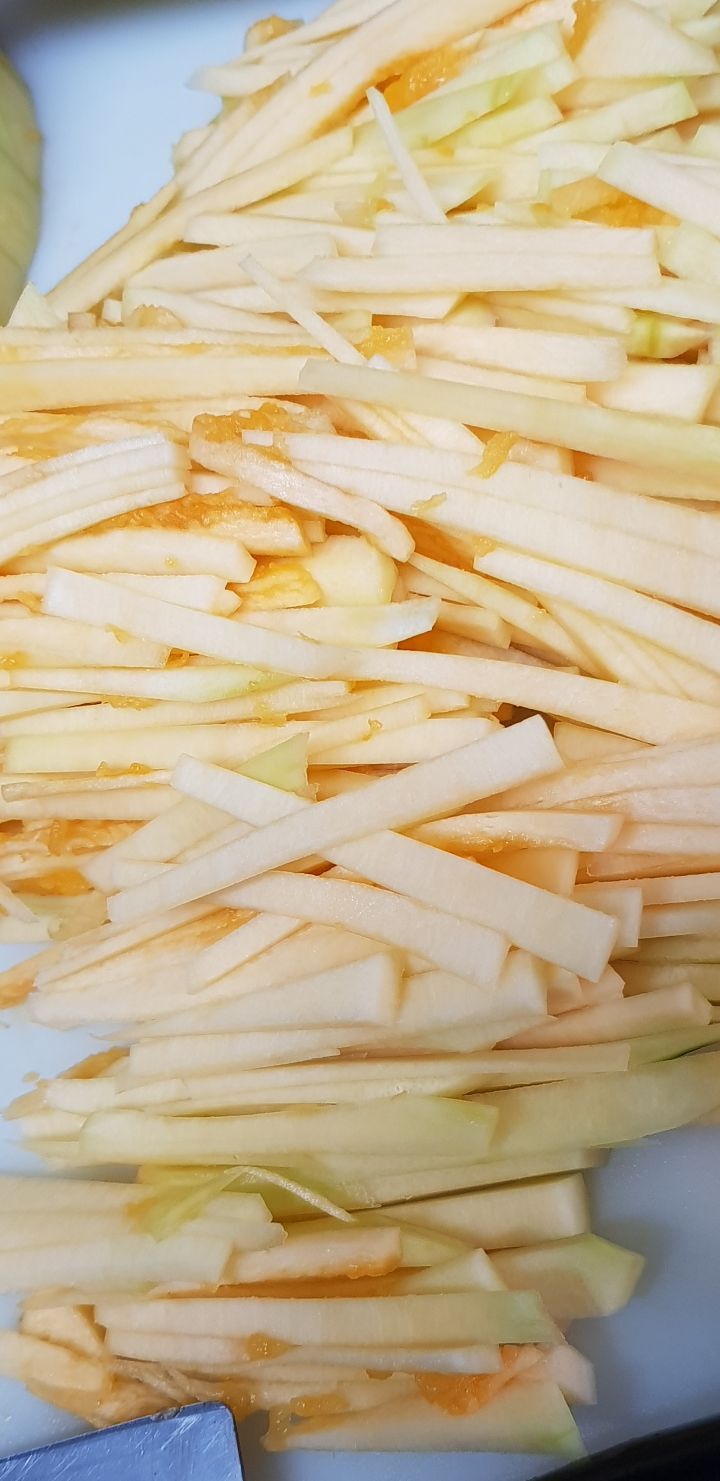채썬 늙은호박에 소금 두꼬집정도 넣고 조물조물 버무린후 잠시 그대로 두면 호박이 절여지면서 물기가 나와요.