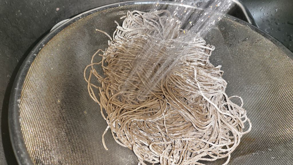 국수를 삶을 때 겉에 묻은 흰 가루를 씻어버리고 삶았습니다.