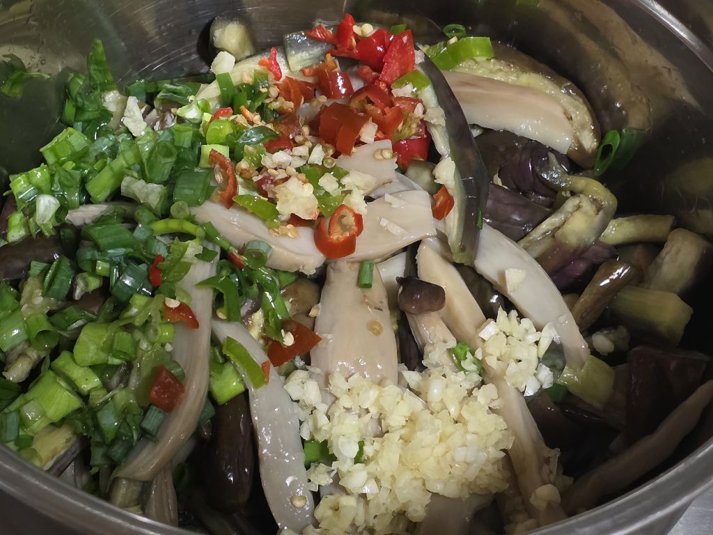 가지와 새송이를 취향에 맞게 가르고 잘라서 물이 끓을 때 채반 얹고 찝니다.