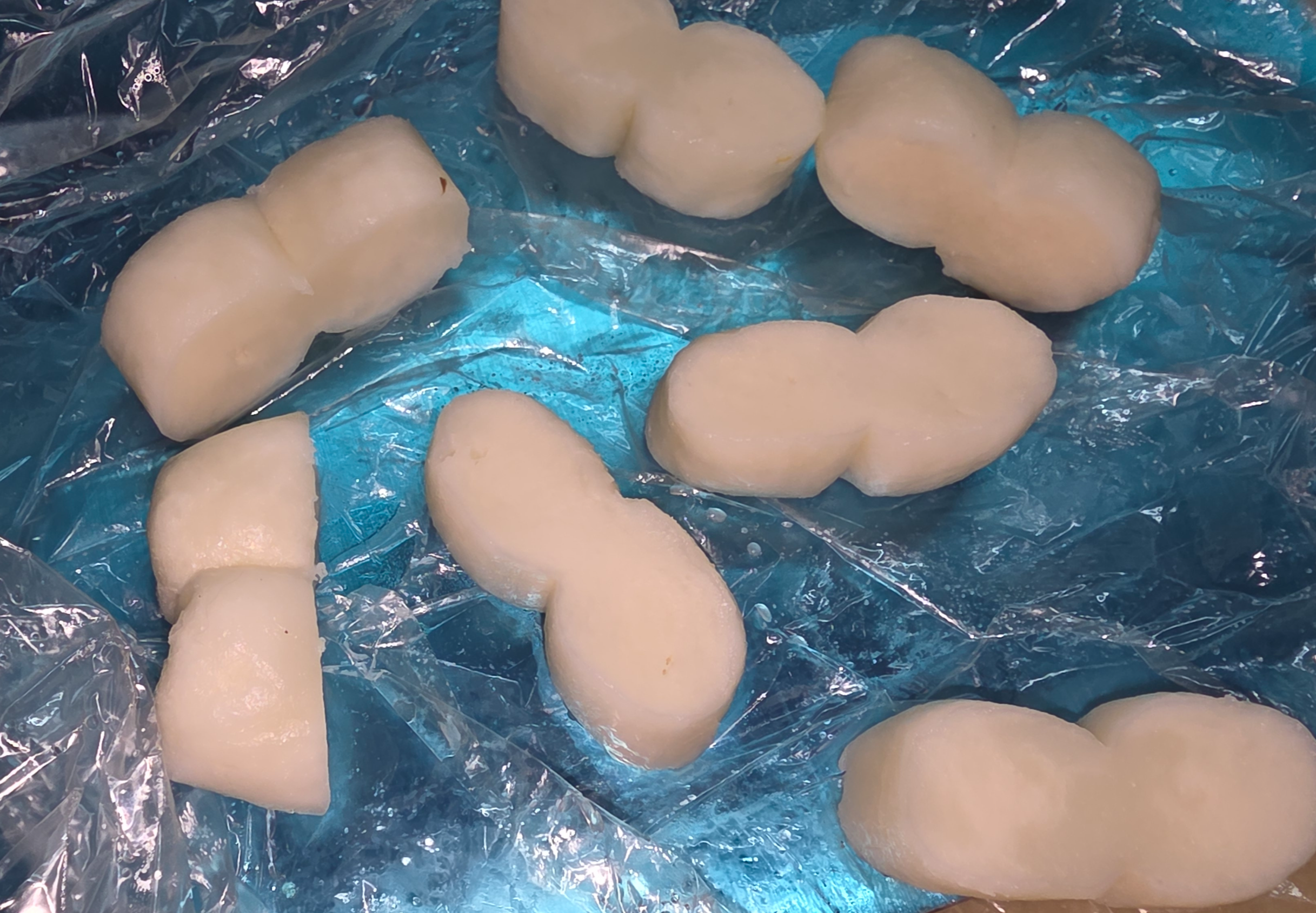 가래떡을 두 줄씩 냉동에 두었다가 말랑하게 익혀서 썰면 땅콩모양이 됩니다.
