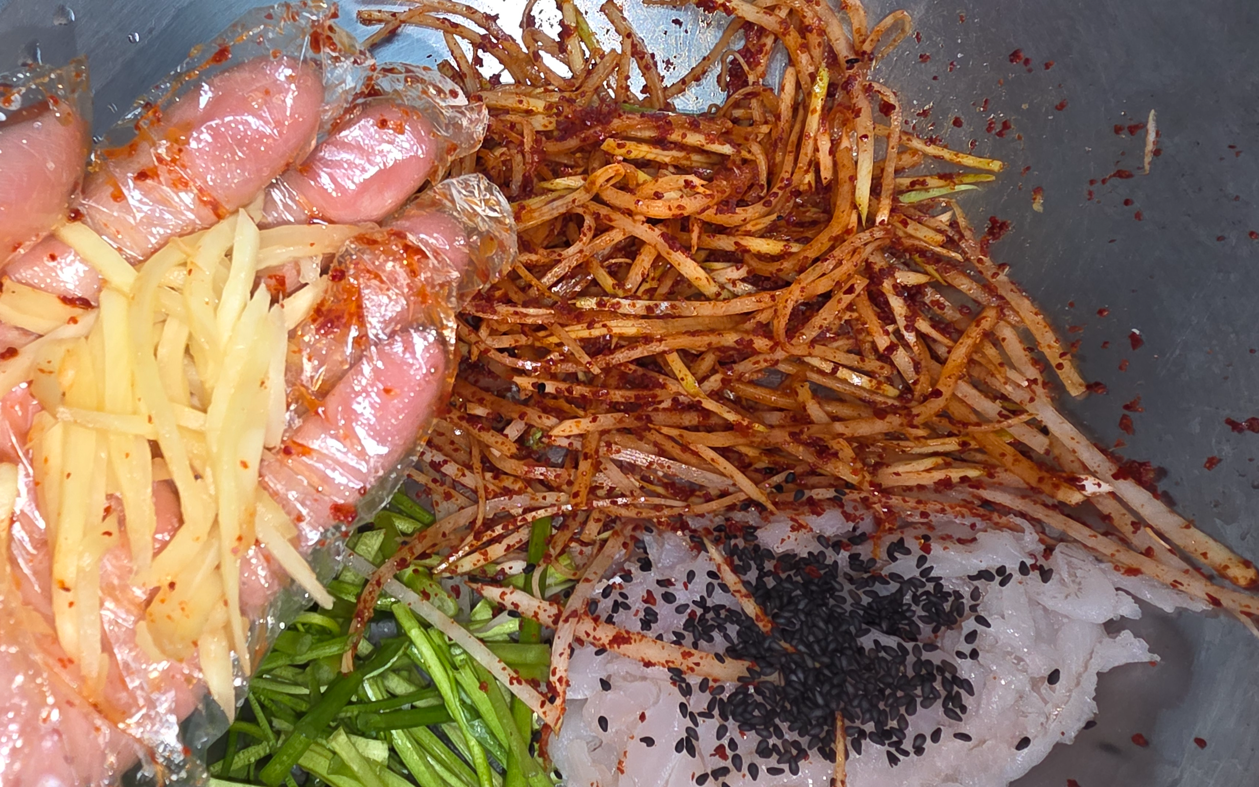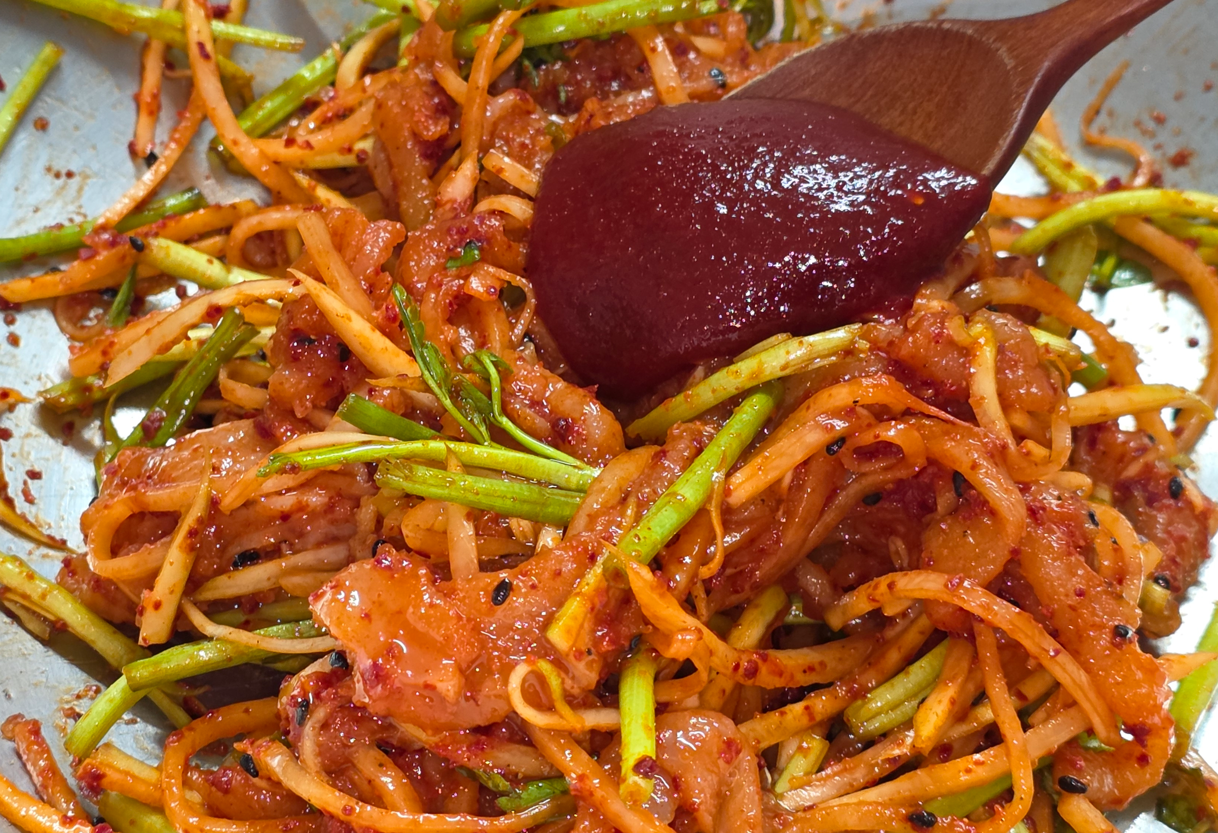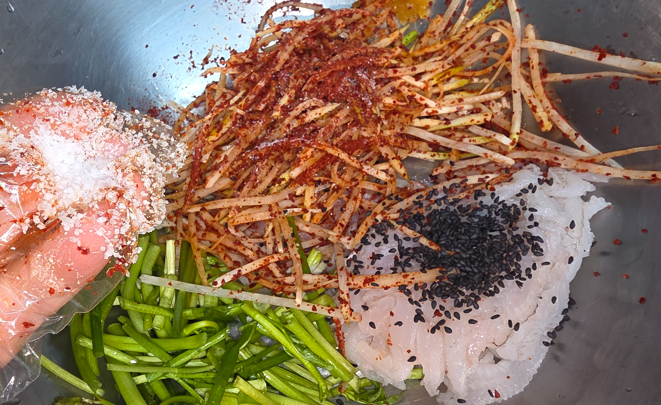 무에 고춧가루를 먼저 넣고 잘 무친 다음 소금 등 다른 양념을 합니다.