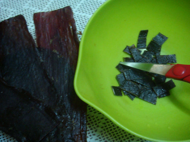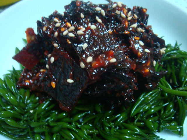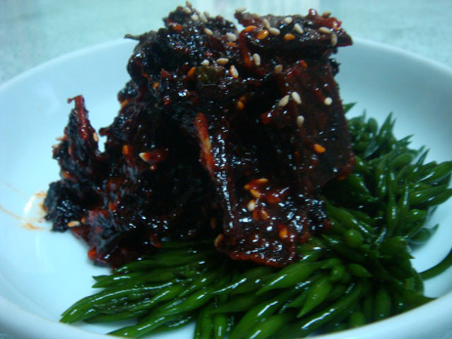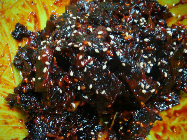 맹지기님표 육포를 아낌없이 김육포짱아치를 밑반찬으로 만들었네요 처음엔 너무되직하게 양념을해서 딱딱해서 먹기안좋았는데 이번엔 양념을 묽게해서 촉촉하니 아주 잘되었네요 맥주안주로 지가 애용하고있는 육포올시다