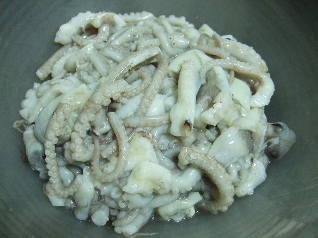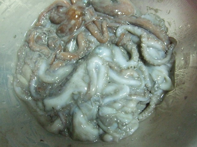 먹통과 함께 손질해 놓은 낙지에 소금을 사용하지 않습니다. 밀가루로 쪼물락~ 쪼물락~ 주물러 놓습니다.