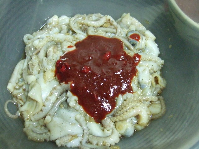 밑간된 낙지에 되직한 양념장을 일부 넣습니다. 저는 볶음용엔 양념장을 나누어 넣습니다...이 또한 조물락~