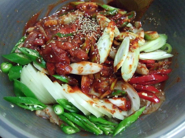 제료 : 낙지. 목살. 양파. 대파. 청양고추. 홍고추. 고추장. 고추가루. 생강. 마늘. 양파시렆.
