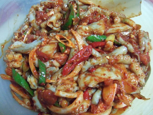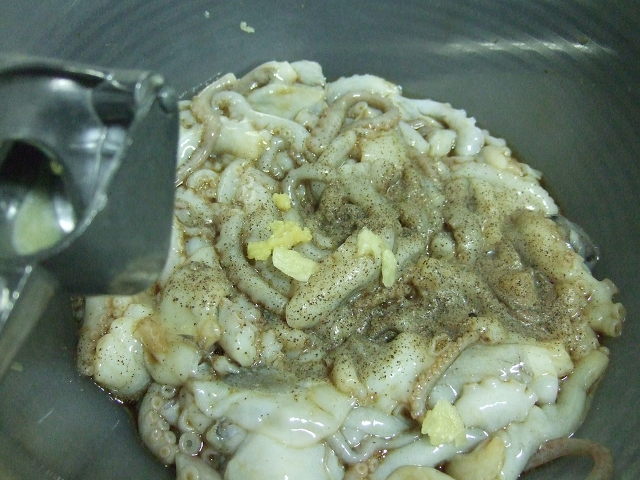잘 손질된 낙지에 술(집에 있는것 활용)과 후추와 생강 쬐~금...다진마늘 약간을 넣고 밑간이 들도록 놓아 둡니다.