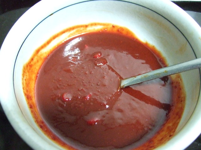 양념장을 되직하게 만듭니다 - 고추장,고추가루,간장,양파시렆많이,사과시렆약간,깨소금,다진마늘1/2,