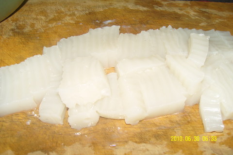 잘 성형된 올갱이 묵을 묵칼로 예쁘게 먹기 좋은 크기로 잘라서