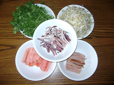 신란쵸(녹색), 생죽주, 오징어, 일본맛살, 쇠고기, 햄, 새우,를 준비하여 알맞은 크기로 씻고 다듬어 놓는다