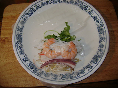 라이스페이프라고 종이처럼 얇게 만든 둥근 혹은 네모난 피가 있는데 끓은 물에 접시의 반을 10초 쯤 담그고