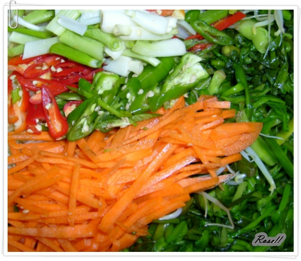 소금으로 간 맞추고 깨 술술 뿌리면 미나리.콩나물 김치 완성 입니다..