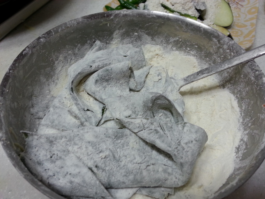 가지를 넣고 흔들어 가지에 밀가루옷이 입혀지면..달걀만 묻혀서