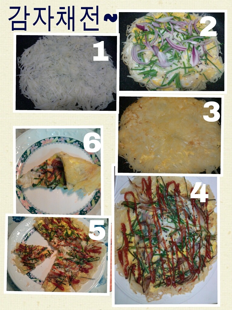 1. 감자채 곱게썰어 팬에올리고 계란1개 고루편후 소금,후추 솔솔~(밀가루,부침가루 없이도 잘부쳐집니다)