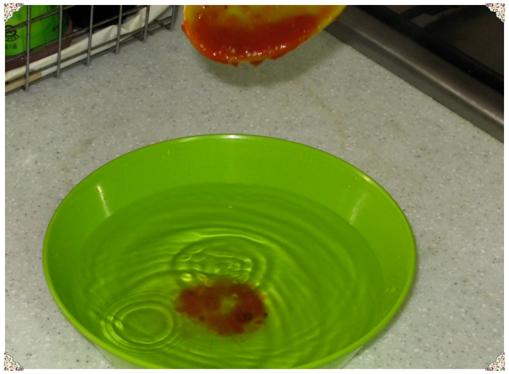 뜨거운물에 데쳐서 껍질을 벗겨내고