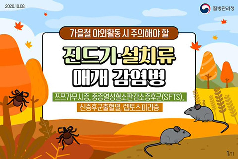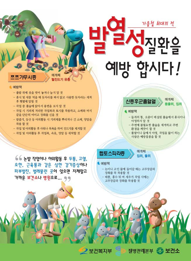 이런 야외생활에서 생길 수 있는 대표적인 우리나라 가을철 질병이 1)유행성 출혈열, 2)렙토스피라증, 3)쯔쯔가무시병 등이다.