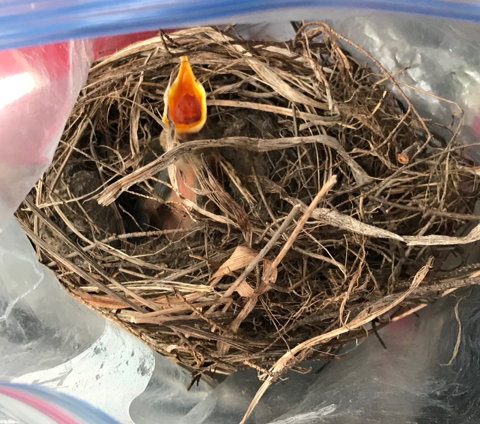 새끼를 포기한다네요 ㅠ 그래서 가지고 있던 간식 가방에 둥지째 일단