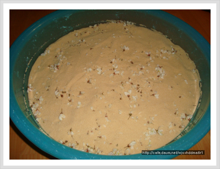 큰 통에 아카시아꽃 3 바가지 : 설탕 2 바가지
