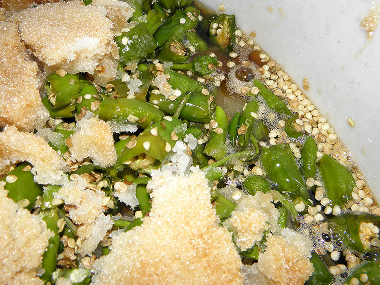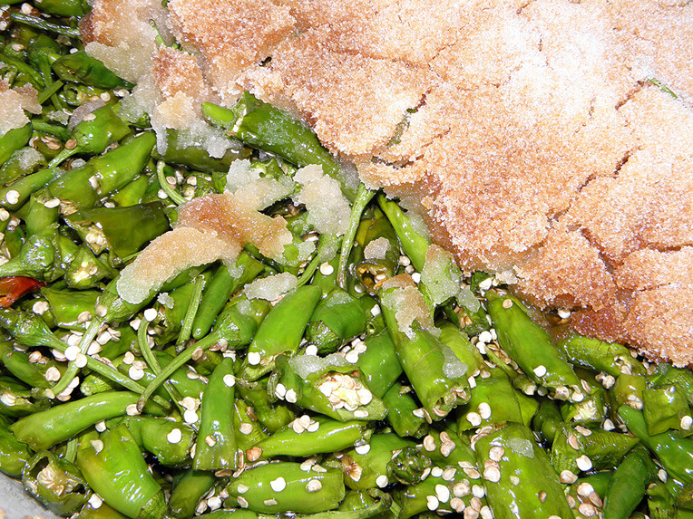 이틀 지나니까 고추에서 수분이 빠지면서 설탕이 녹았어요.