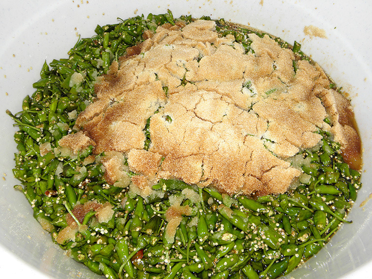 청량고추 10kg인데... 갈색설탕 3kg 3봉지 이미 들어갔었고 유리병에 옮김후 다시 1.5kg정도를 부어서 설탕 덮게를 만들어줬어요.